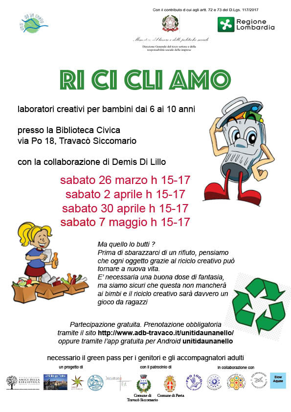 Sabato 26 marzo 2022 si terrà il primo di quattro appuntamenti per bambini sul tema del riciclo, presso la Biblioteca Civica di Travacò Siccomario in Via Po 18.
