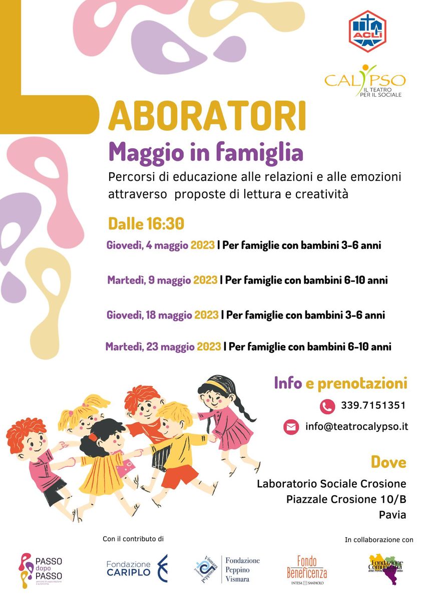 Laboratori di maggio in famiglia con Calypso il teatro per il sociale, percorsi di educazione alle relazioni e alle emozioni attraverso proposte di letttura e creatività.