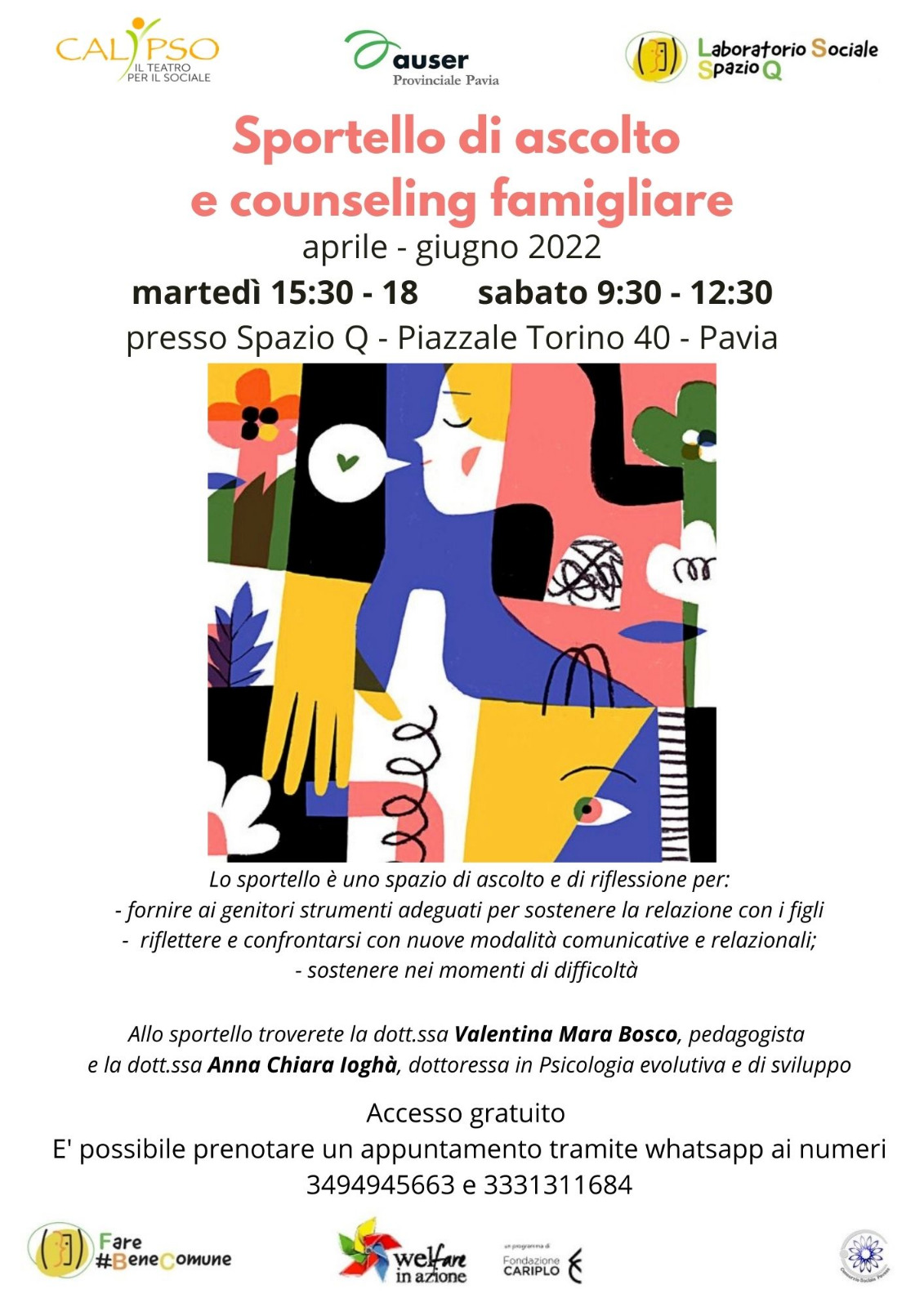 Aperto lo sportello di ascolto e riflessione per sostenere le persone nei momenti di difficoltà e per fornire ai genitori strumenti adeguati per la relazione con i figli, per riflettere e confrontarsi su nuove modalità relazionali e comunicative. Lo trovi a Spazio Q in Piazzale Torino 40 a Pavia.